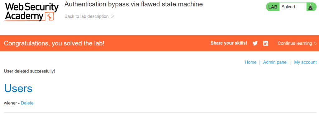 This lab makes flawed assumptions about the sequence of events in the login process. To solve the lab, exploit this flaw to bypass the lab’s authentication, access the admin interface, and delete the user carlos