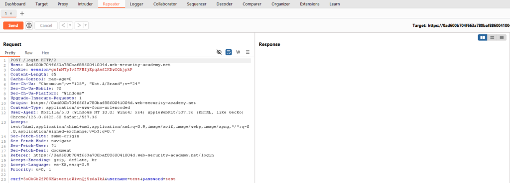 Si vamos a ‘My account’ e intentamos iniciar sesión varias veces con un usuario o contraseña incorrectos no nos permitirá volver a intentarlo en 1 minuto. Tomaremos una petición del ‘Logger’ y la llevaremos al ‘Repeater’ con Ctrl + R o Click derecho -> Send to Repeater: