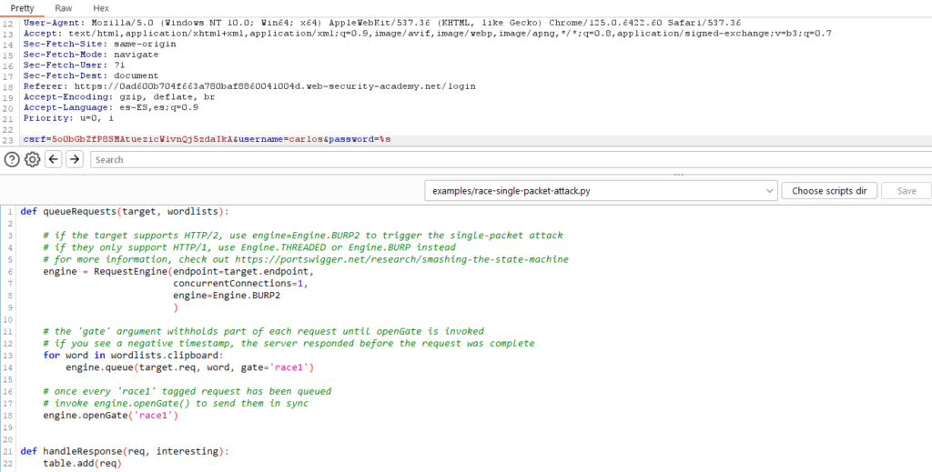 - Se ha selecionado el script de ‘race-single-packet-attack.py’, dado que estamos trabajando con una conexión HTTP2.
