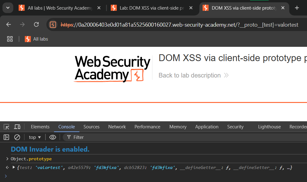 Para añadir al objeto __proto__ el atributo ‘test’ con el valor ‘valortest’. Si al acceder llamamos al objeto ‘Object.prototype’, veremos que lo hemos inyectado correctamente: