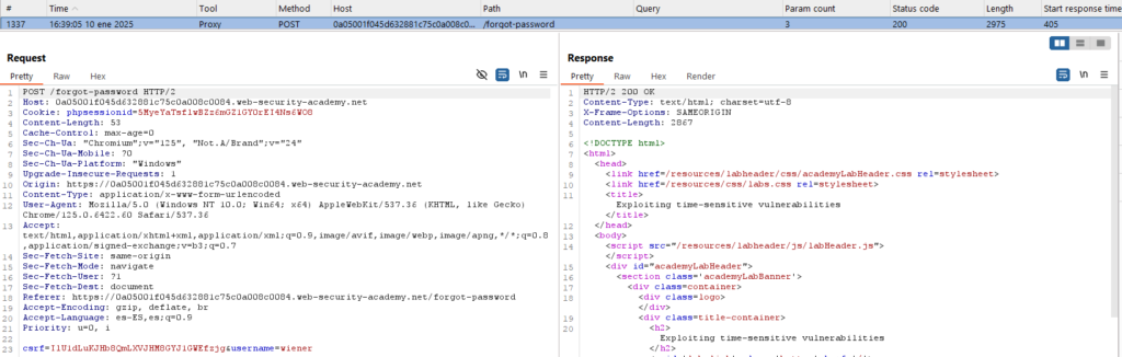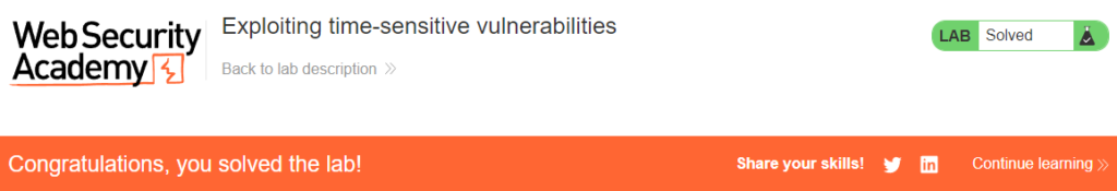 Nota: A veces esto no funcionará, y habrá que generar otra cookie de sesión y token CSRF para la petición de ‘carlos’ y volverlo a enviar. En mi caso funcionó con la primera petición tardando 391 ms y la segunda 93 ms, pero tuve que enviarlas 15 veces para que funcionara.