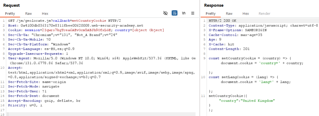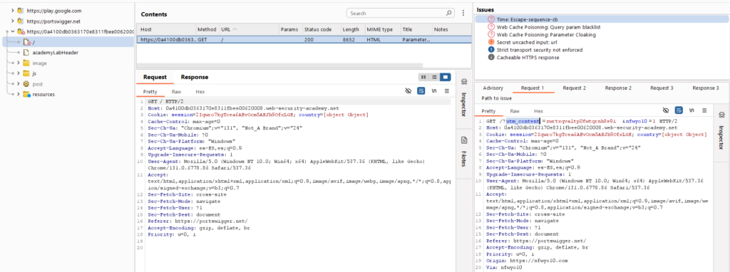 En este caso, la contaminación del parámetro se puede realizar con ‘;’, esto porque probablemente el frontend y el backend estén programados en lenguajes distintos. El frontend no interpreta el ‘;’ como un separador de parámetros, pero el backend sí. Como para el frontend ‘;callback=alert(1)’ es parte del parámetro que no afecta a la creación de caché único lo usa para obtener el general. El backend, sin embargo, interpreta el ‘;’ como un serparador y sobreescribe el valor del nombre de la función en JavaScript.