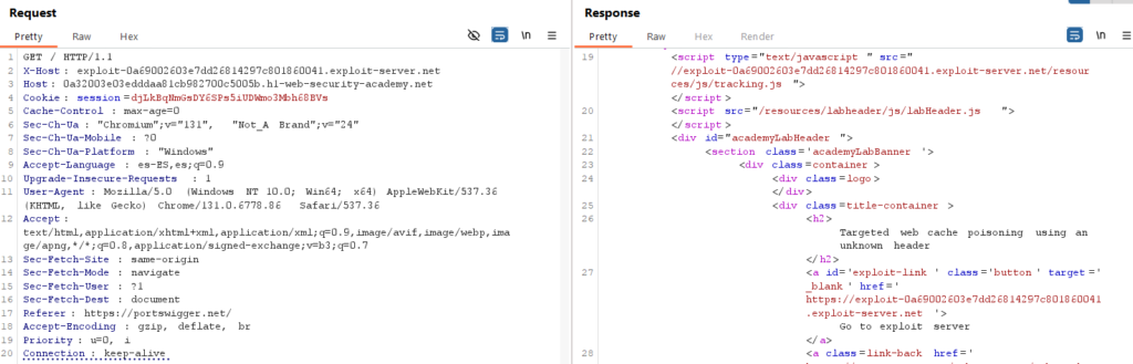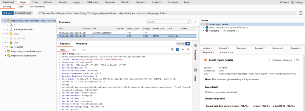 Entramos al laboratorio y enviamos del ‘Logger’ al ‘Repeater’ la petición de la raíz ‘/’ con Ctrl + I o Click derecho -> Send to Repeater. Allí daremos Click derecho en la parte de Request -> Extensions -> Param Miner -> Guess headers. El resultado obtenido aparecerá en la pestaña ‘Target’ y será el siguiente: