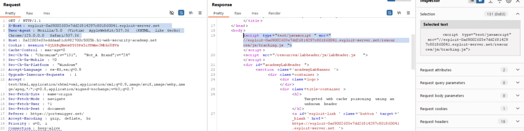 This lab is vulnerable to web cache poisoning. A victim user will view any comments that you post. To solve this lab, you need to poison the cache with a response that executes alert(document.cookie) in the visitor’s browser. However, you also need to make sure that the response is served to the specific subset of users to which the intended victim belongs.
