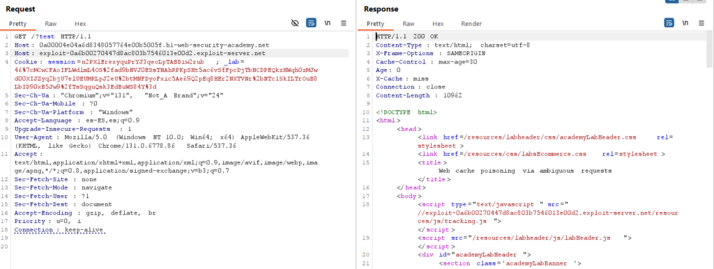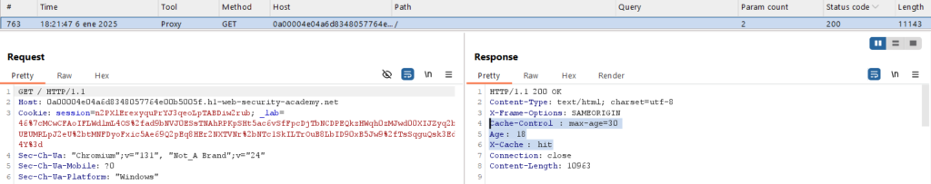 Entraremos en el laboratorio y veremos el encabezado HTTP de la página en el ‘Logger’. Vemos que tiene los tres parámetros necesarios para realizar un envenenamiento de caché.