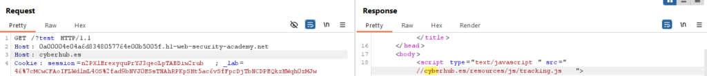 Vemos que si cambiamos el valor del atributo ‘Host’ nos devolverá una página de error, pero si insertamos otro atributo ‘Host’ con diferente valor no sólo funcionará la página, sino que sobrescribirá la ruta de un archivo JavaScript: