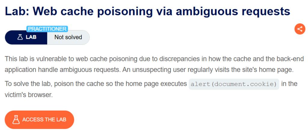To solve the lab, poison the cache so the home page executes alert(document.cookie)